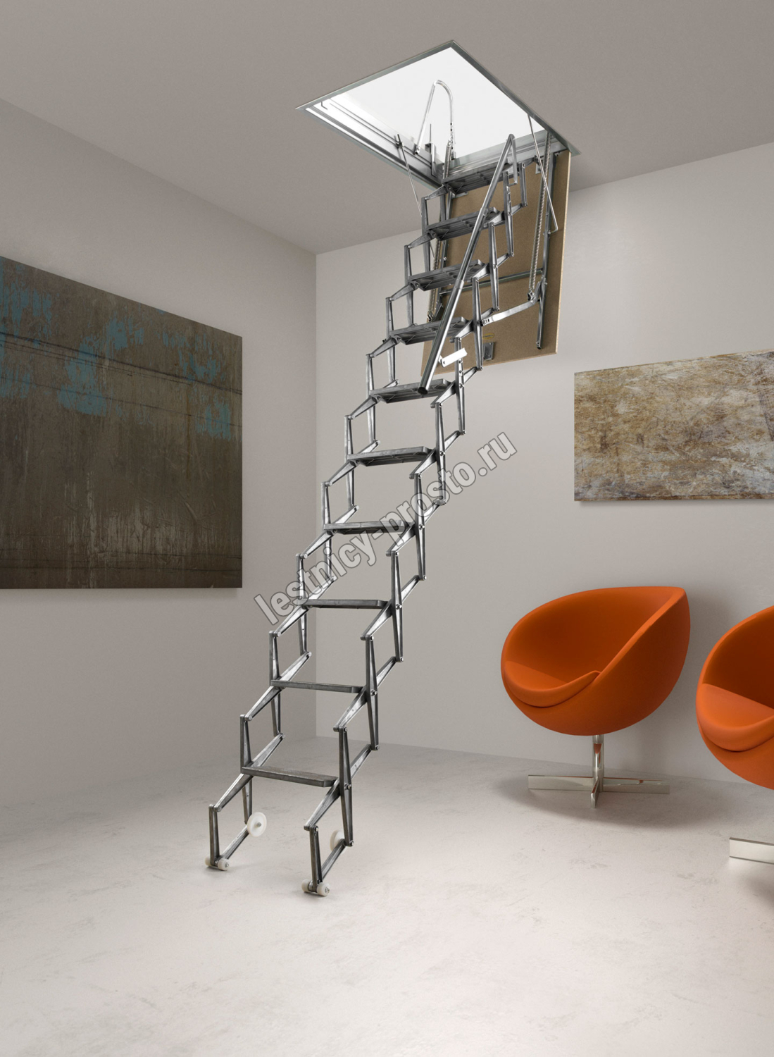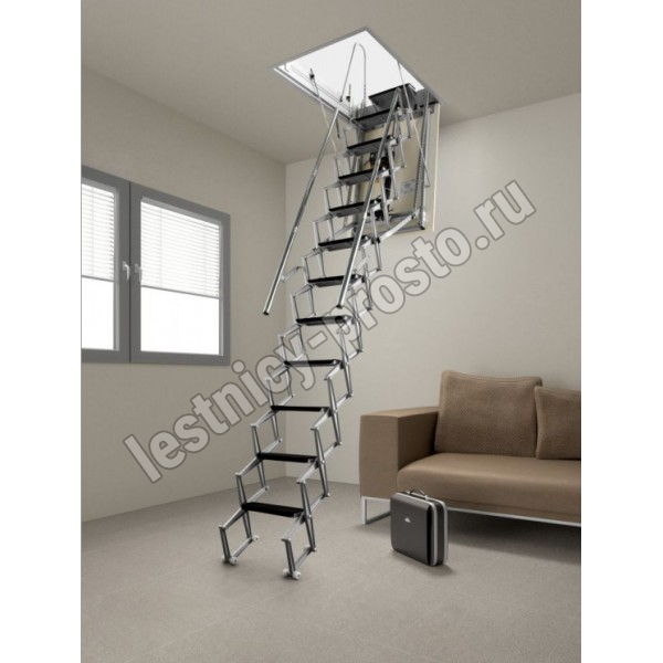 Автоматическая раздвижная ножничная чердачная лестница, с электромотором для дистанционного открывания.