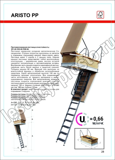 Лестница чердачная складная металлическая 3-х секционная. Ступени полностью выполнены из металла и покрашены порошковой краской. Лестница имеет 2 короба и 2 крышки люка. Нижняя крышка лестницы представляет собой многослойную конструкцию – деревянная рама, внутри которой находится теплоизоляция и противопожарная вставка. Внутренняя часть крышки покрыта оцинкованной жестью, наружная часть белой эмалью и защитной пленкой. Толщина крышки 60мм. Верхний люк выполнен из влагостойкой фанеры и обработан антигрибковым средством. Короб металлический высотой 140мм по периметру проходит уплотнитель. Все соединяющие части изготовлены из твердого материала и имеют оцинкованное покрытие.