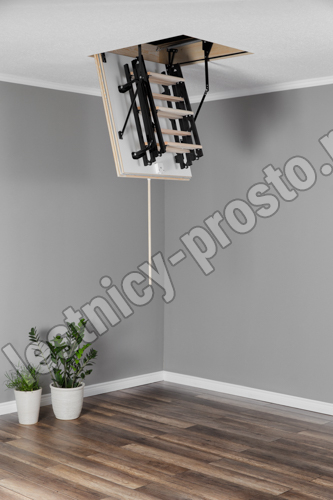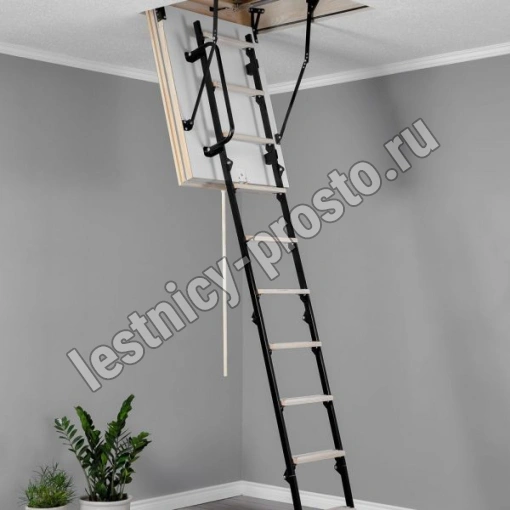 Складная 4-х секционная чердачная лестница. Ступени выполнены из сосны, имеют противоскользящие насечки, направляющие из металла