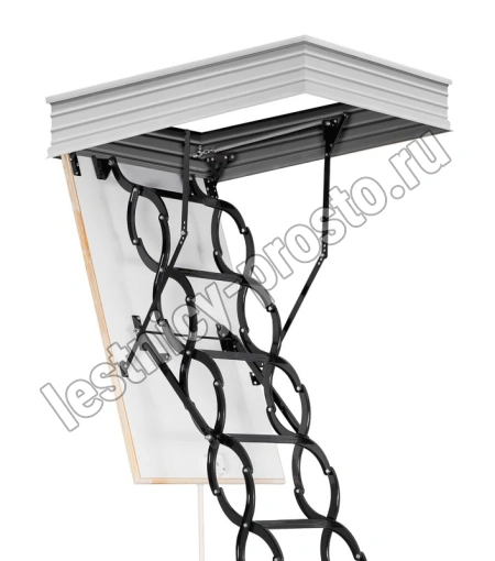 Все элементы лестницы выполнены из экологически чистых материалов и обработаны веществами, не содержащими тяжелых металлов. На ступенях антискользящие насечки. Короб лестницы изготовлен из металла. Термоизоляционная крышка типа "сэндвич" утеплена пенопластом, облицована с двух сторон ДСП белого цвета. Короб люка с уплотнителем. В комплекте деревянный стержень для открывания лестницы.