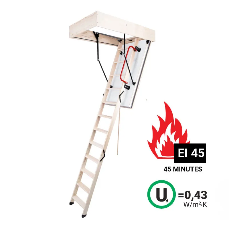 Лестница идеально подходит для установки в помещениях  подверженных риску возгорания, её противопожарные свойства позволят эффективно изолировать помещение, в котором возник пожар, от чердака, тем самым предотвращая дальнейшее распространение огня. Предел огнестойкости (EI) 45 минут.