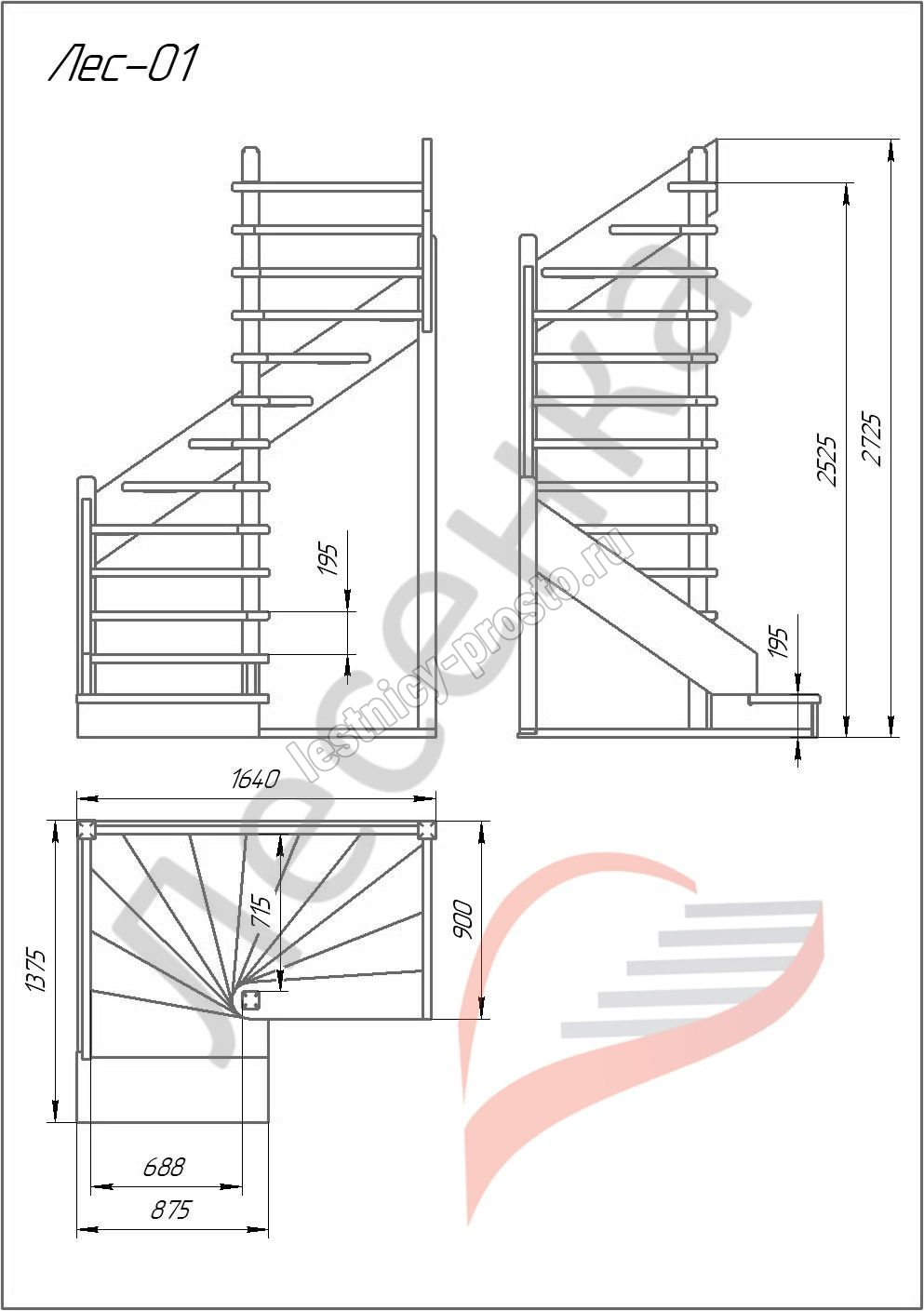 Деревянная межэтажная лестница ЛЕС-01 2525-2720 проем 1640-900, Лиственница