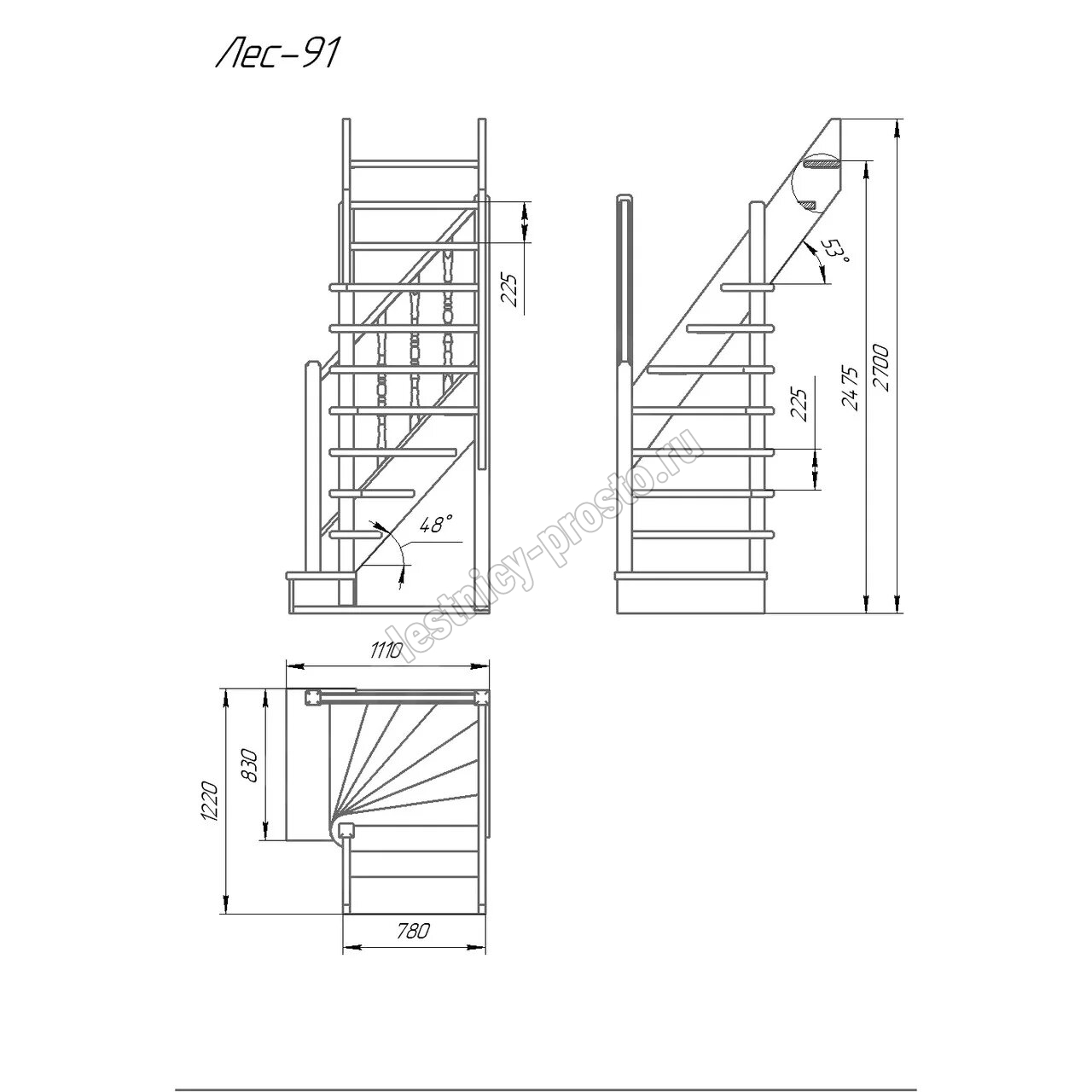 Деревянная межэтажная лестница ЛЕС-91 2475-2700 проем 1220-800, Сосна