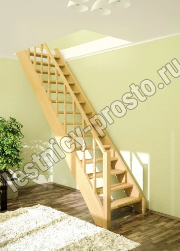 Базовый комплект включает в себя деревянные элементы лестницы и ограждения без какого-либо покрытия. Ограждение монтируется с любой стороны. Дополнительно к этой лестнице можно установить пристенные поручни ( в базовый комплект не входят)