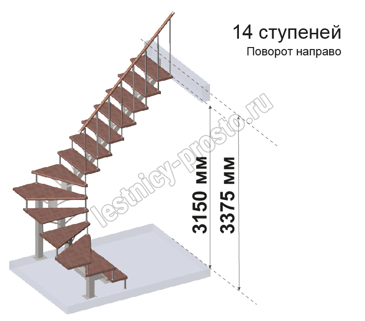 Комплект ограждений для П-образной лестницы PROSTO MONO из 14 ступеней.