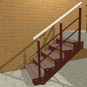 Ступени лестницы состоят из металлической рамки, обеспечивающей необходимую прочность, и покрытия из террасной доски ДПК (древесно-полимерный композит). Ступени не боятся воды и мороза, не теряют со временем свой внешний вид и не требуют ухода.