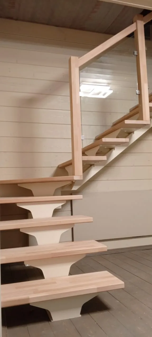 Ступени лестницы изготовлены из дерева категории А/В паркетной склейки без какого-либо покрытия. Вы можете заказать у нас предварительную профессиональную покраску деревянных элементов материалами БИОФА в широкий спектр цветов (стоимость зависит от количества ступеней).