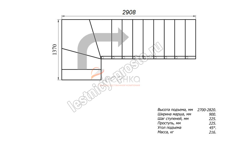Модульная лестница Фаворит 225 2700-2820, Серый, Сосна, Нержавеющая сталь