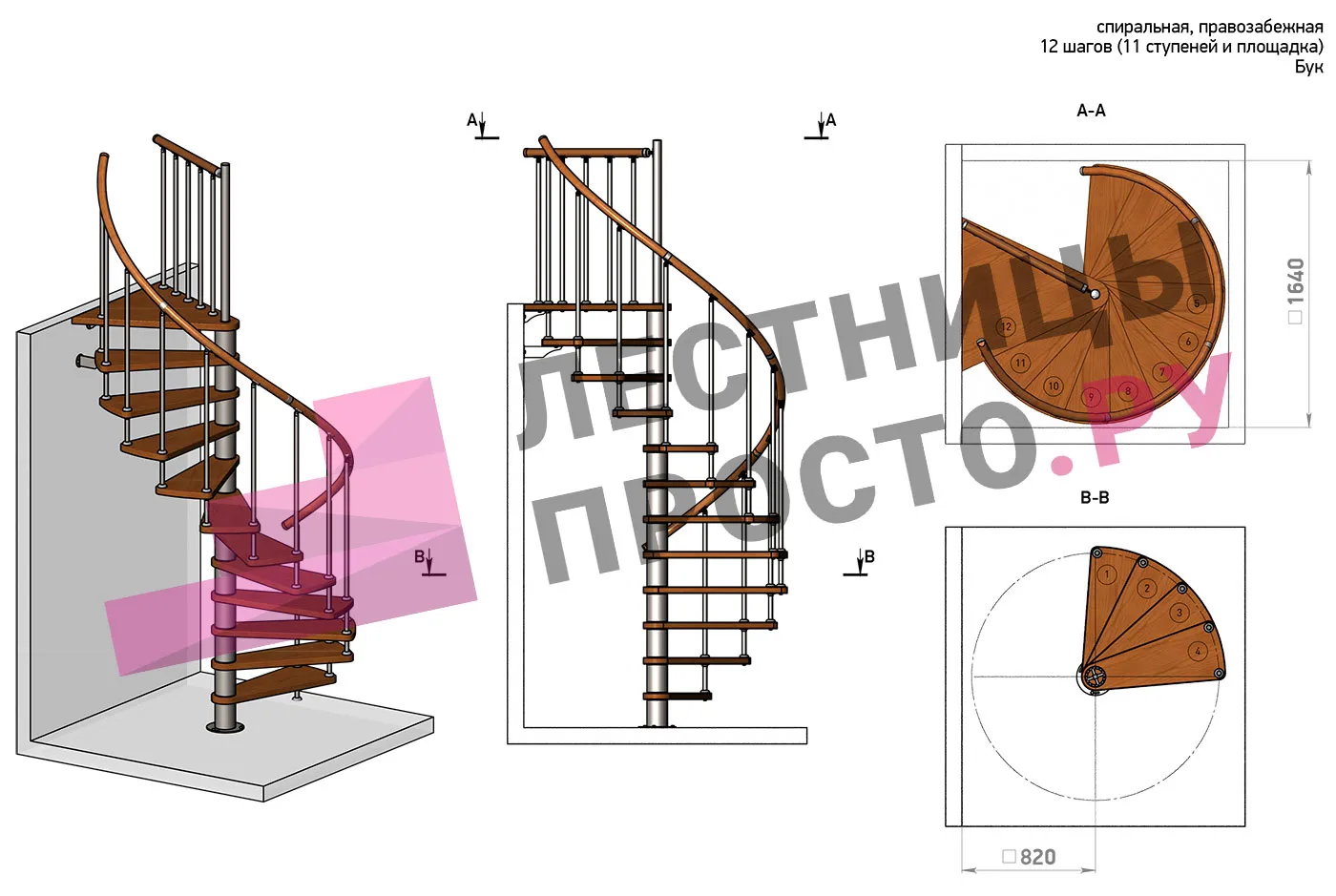 Решение о направлении поворота принимается при сборке лестницы - универсальная конструкция позволяет собрать правозабежную и левозабежную лестницы. Высота ступеней регулируется с шагом 3 мм. в пределах 217-247 мм., благодаря чему, лестница прекрасно подгоняется под необходимую высоту.