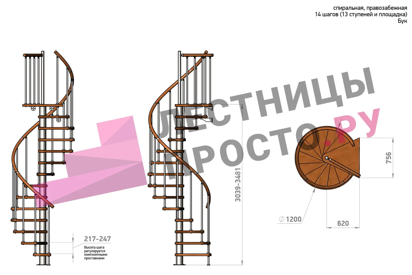 Правая, d=120см, 13 ступеней + площадка