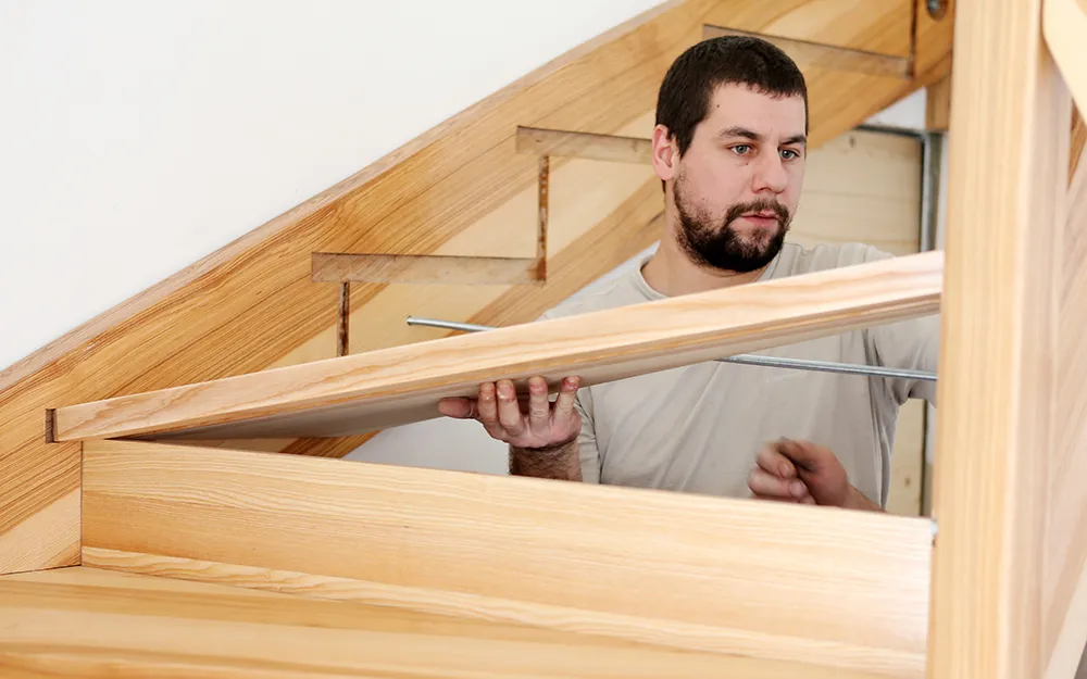 4. Укладывают на ступени вторую тетивы, контролируя, чтобы все ступени и подступенки попали в пазы.